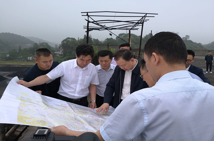 圖為李江河(左四)認(rèn)真察看項(xiàng)目選址圖。