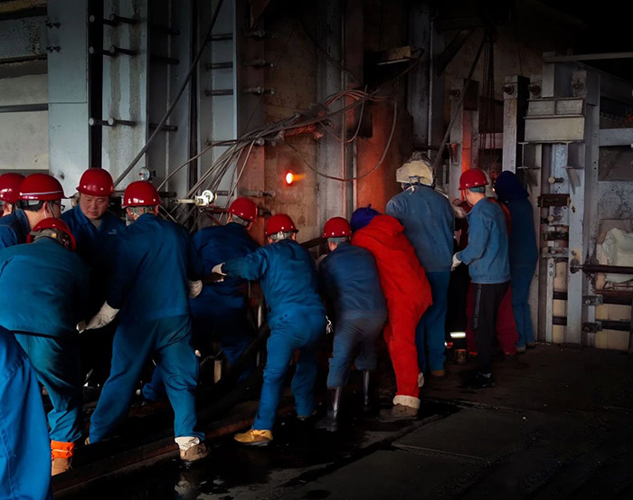 上午8點半,在熔窯卡脖部位,一股股的熱氣不斷從拆掉擋火板后的爐門中噴涌而出,溫度超100℃。在熔爐南北兩邊,參與“戰(zhàn)斗”人員按照各自分工迅速就位:一部分人將提前制作的水包運至熔化工段;另一部分人檢查卡脖吊掛設(shè)施。接著,穿著厚厚保溫棉衣的保窯工和鉗工一起,拆卸深層水包的固定裝置。爐內(nèi)通紅的烈焰是熔化的玻璃液,即使離了10多米遠,都能感到它的熱度,多待一會臉上如針扎般疼痛。